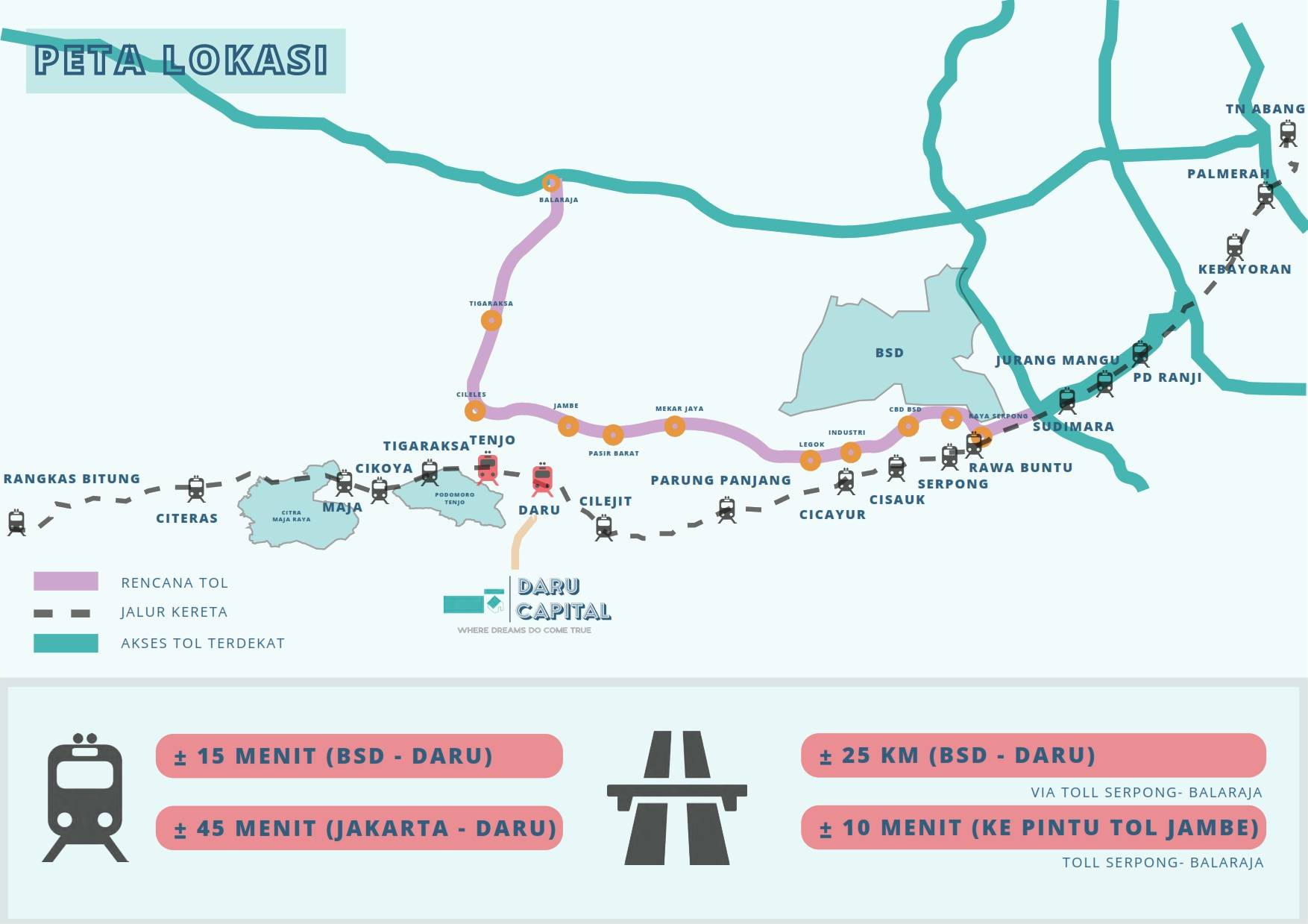 Daru Capital memiliki luas lahan sekitar 9,8 hektar dengan 3 cluster & 10,000 sqm green area yang berada di kawasan Daru dan menjadi pilihan terbaik perumahan dekat stasiun Daru dan juga Exit Tol Serpong-Balaraja (Exit Tol Jambe)